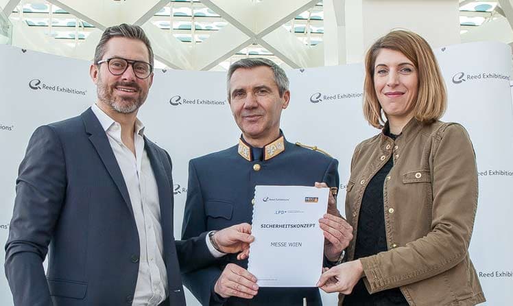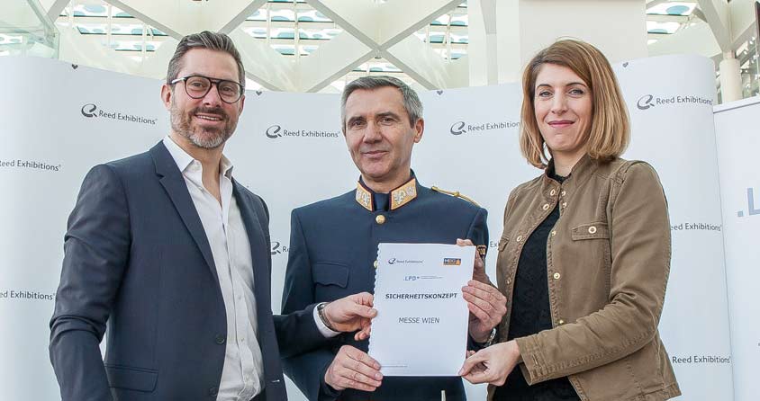 Ab sofort bietet die Messe Wien ihren rund 742.000 Gästen pro Jahr mehr Sicherheit: Das neue Sicherheitskonzept wurde im feierlichen Rahmen von Landespolizeivizepräsident Franz Eigner an Benedikt Binder-Krieglstein, CEO der Reed Exhibitions, und Katharina Weishaupt, Geschäftsführerin der Wiener Messe Besitz GmbH, übergeben.