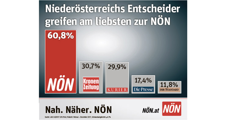 Die brandneue Business-to-Business Studie LAE 3.0/2017 bescheinigt der NÖN in NÖ abermals einsame Spitzenwerte. Sowohl in der Leser pro Ausgabe Analyse mit 60,8%, als auch in der Crossmedia Erhebung mit 66,2% ist die NÖN auf Platz 1.