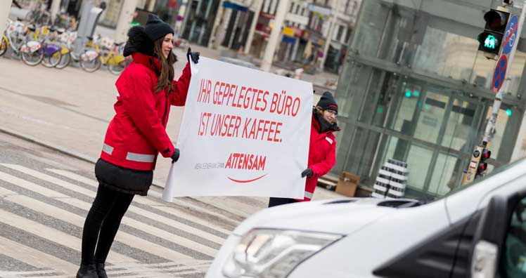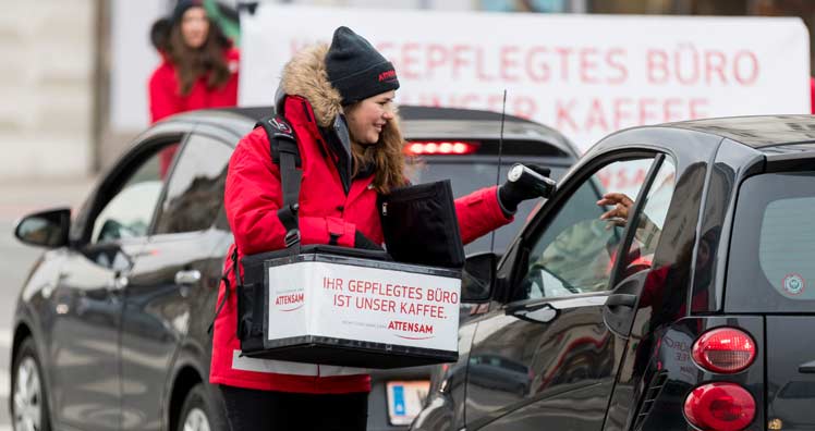 Diese Woche verteilen allmorgendlich Attensam-Promotoren Eiskaffee aus dem Bauchladen an wartende Autolenker bei roten Ampeln. Die Wartephase nutzt das Promotorenteam von Attensam, um ein Straßentransparent mit dem Slogan "Ihr gepflegtes Büro ist unser Kaffee" über den Zebrastreifen zu tragen und damit auf die Dienstleistungen von Attensam in der Bürobetreuung hinzuweisen.
