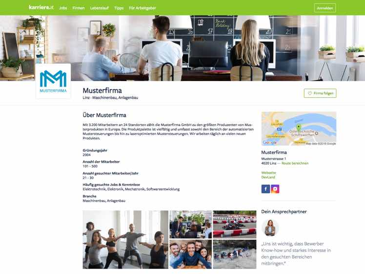 karriere.at unterstützt Arbeitgeber seit Jahren beim Kommunizieren ihrer Arbeitgebermarke. Die employer.page Plus komplettiert das karriere.at-Angebot als zusätzliche Lösung zur attraktiven Arbeitgeber-Präsentation. Ein starkes Arbeitgeberprofil mit individuellem Design und Hervorhebung auf karriere.at unterstützt die Imagebildung bei potenziellen Mitarbeitern. Dieses richtet sich in besonderer Weise an jene Unternehmen, die gerade dabei sind, ihre Employer Brand zu entwickeln und zu schärfen.