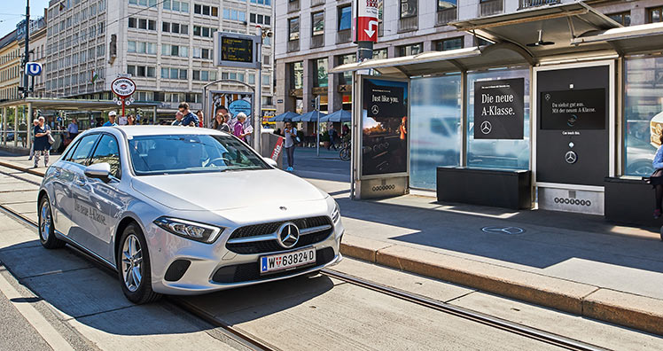 Zur Einführung der neuen A-Klasse in Österreich sorgen Mercedes-Benz Österreich und Gewista für Aufsehen. Eine gebrandete Straßenbahn-Wartehalle vor der Wiener Oper wurde zum interaktiven Mercedes-Benz Showroom umgestaltet, wo Fahrgäste und Passanten erstmals per Knopfdruck eine unmittelbare Probefahrt erleben konnten. Ein interaktiver Bildschirm mit Touch-Funktionen wie in der neuen A-Klasse bot alle Informationen, Bilder und Videos zum Fahrzeug und lud zur Probefahrt ein. Wer den installierten Button drückte, wurde wenige Minuten später direkt beim Wartehaus von einer A-Klasse zur Probefahrt um die Ringstraße abgeholt. Zusätzlich bot der Wartehaus-Showroom Features wie eine Selfie-Kamera, einen Soundteppich sowie Beacons, die ein Signal Mobilfunkgeräte mit aktiviertem Bluetooth im Umfeld sendeten und zur Installation einer Mercedes-App einluden. Die neue A-Klasse wird darüber hinaus noch bis 16. Mai per City Lights Kampagne in ganz Österreich präsentiert.
