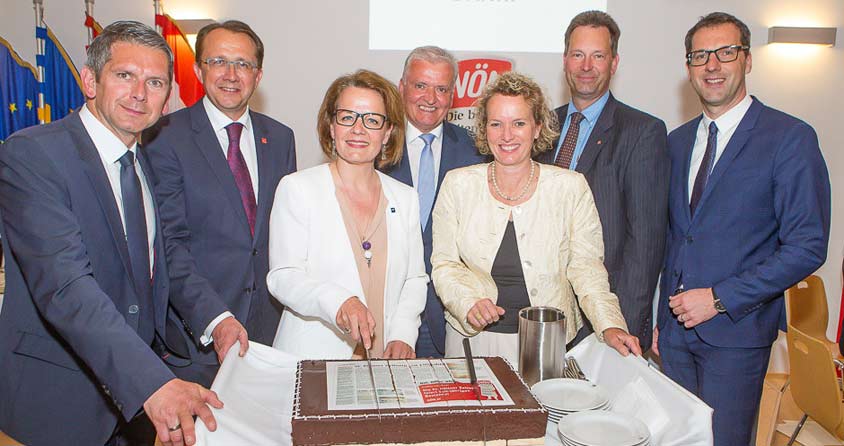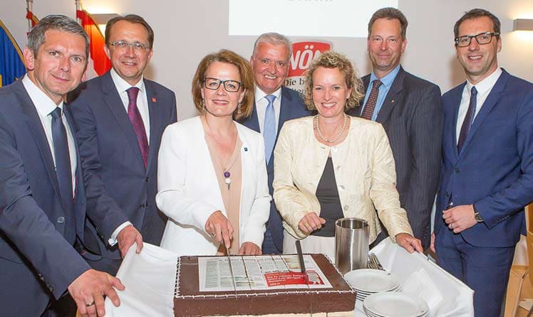 Zum 150. Geburtstag durften sich NÖN-Herausgeberin Gudula Walterskirchen, Pressehaus-Geschäftsführer Friedrich Dungl und die beiden Chefredakteure Daniel Lohninger und Walter Fahrnberger über eine große Torte und viele herzliche Glückwünsche freuen: Beim Festakt in St. Pölten zelebrierten rund 150 Gäste das Jubiläum des geschichtsträchtigen Pressehauses.