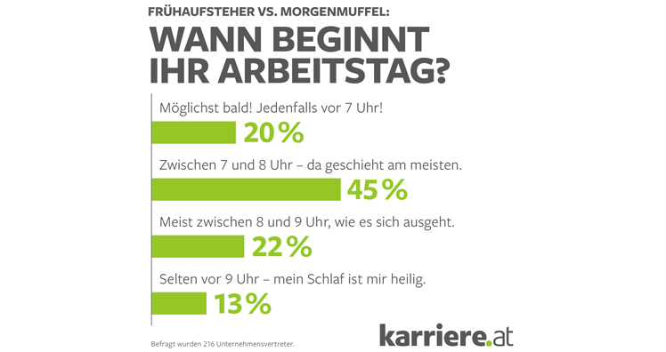 Eine ähnliche Tendenz weist die gleichzeitig durchgeführte Befragung von 216 Unternehmensvertretern (HR-Manager, Führungskräfte, Unternehmer) auf: Zwar trifft in dieser Gruppe nur jeder Fünfte (20 Prozent) schon vor 7 Uhr am Schreibtisch ein, die meisten (45 Prozent) sind allerdings in der darauffolgenden Stunde im Büro. Nach 8 Uhr kommen nur 22 Prozent der Unternehmensvertreter, nach 9 Uhr ebenfalls nur 13 Prozent der Befragten.