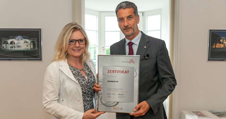 Der Gaming-Technologiekonzern NOVOMATIC wurde zum zweiten Mal in Folge als österreichischer Leitbetrieb zertifiziert. Als Leitbetriebe werden nach einem umfassenden Screening jene vorbildhaften Unternehmen ausgezeichnet, die nachhaltigen Unternehmenserfolg aufweisen, Innovation vorantreiben und sich zu gesellschaftlicher Verantwortung bekennen. NOVOMATIC-Vorstandsvorsitzender Harald Neumann nahm die Auszeichnung von Leitbetriebe Austria-Geschäftsführerin Monica Rintersbacher im Novomatic Forum entgegen.