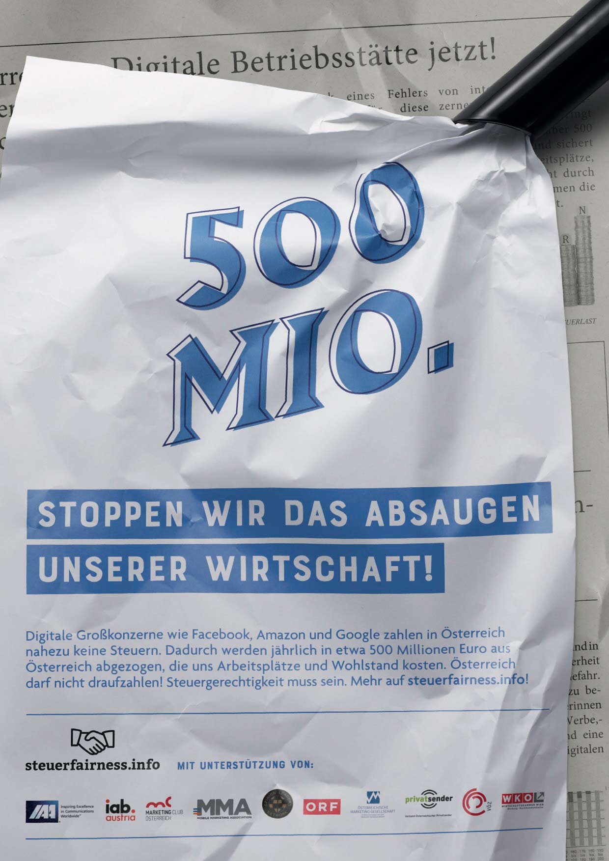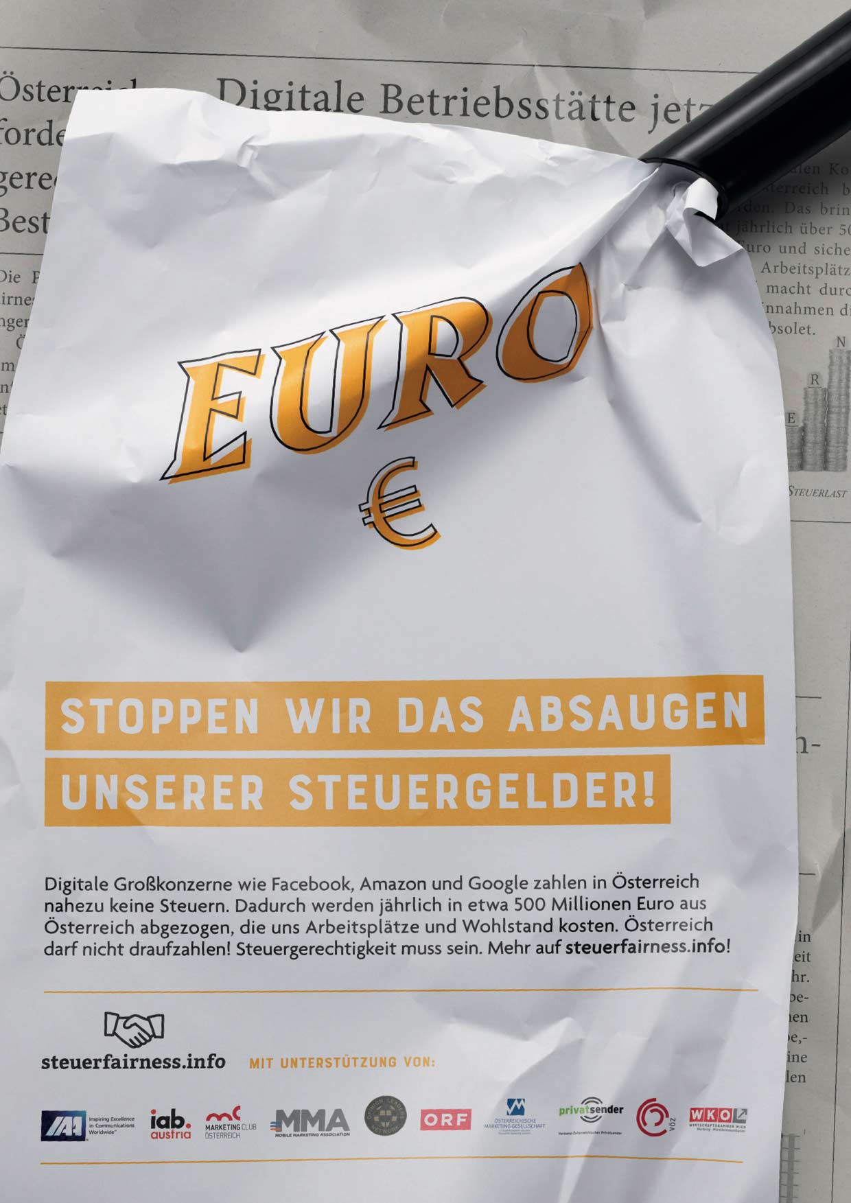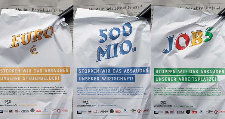 "Digitale Großkonzerne wie Facebook, Amazon oder Google zahlen in Österreich nahezu keine Steuern. Jährlich werden in etwa 500 Millionen Euro aus Österreich abgezogen. Wir wollen beim Absaugen unserer Wirtschaft, unserer Arbeitsplätze und unserer Steuergelder nicht mehr tatenlos zusehen", erklärte die rot-weiß-rote Allianz der Medien- und Marketingbranchezum Auftakt einer gemeinsamen Kampagne für Steuerfairness.