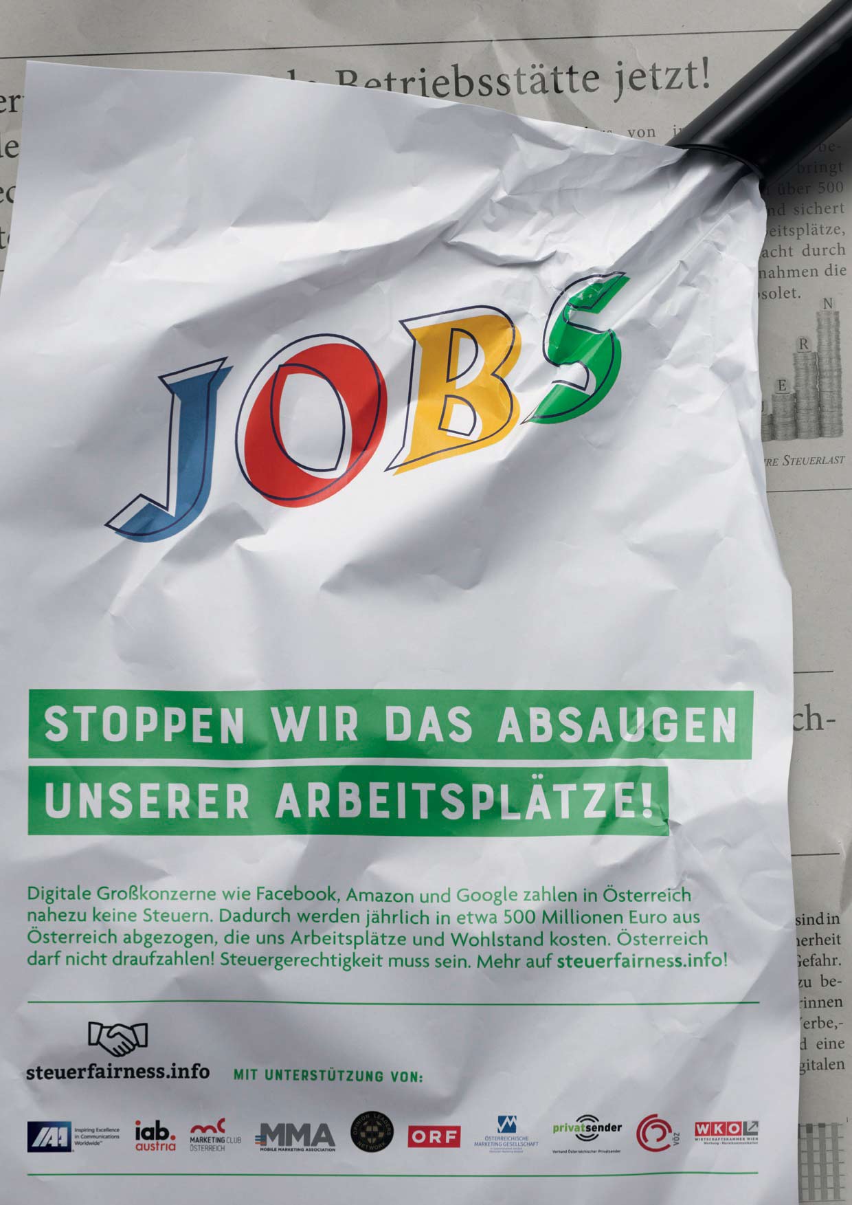 Untermauert und sichtbar werden die Forderungen in der gemeinsamen Kampagne für Steuerfairness. Verantwortlich für Konzeption und Umsetzung zeichnet die Wiener Kreativagentur Kobza and the hungry eyes (KTHE). "Die Kampagne ‚Stoppen wir das Absaugen unserer Wirtschaft‘ bringt das komplexe Thema der ungerechten Besteuerung einfach auf den Punkt und sagt worum es geht: Jobs, Steuergelder und somit Wohlstand für Österreich. Es freut uns diesen Schulterschluss der österreichischen Verbände und Medien zu unterstützen", so Agenturchef Rudi Kobza. (red)