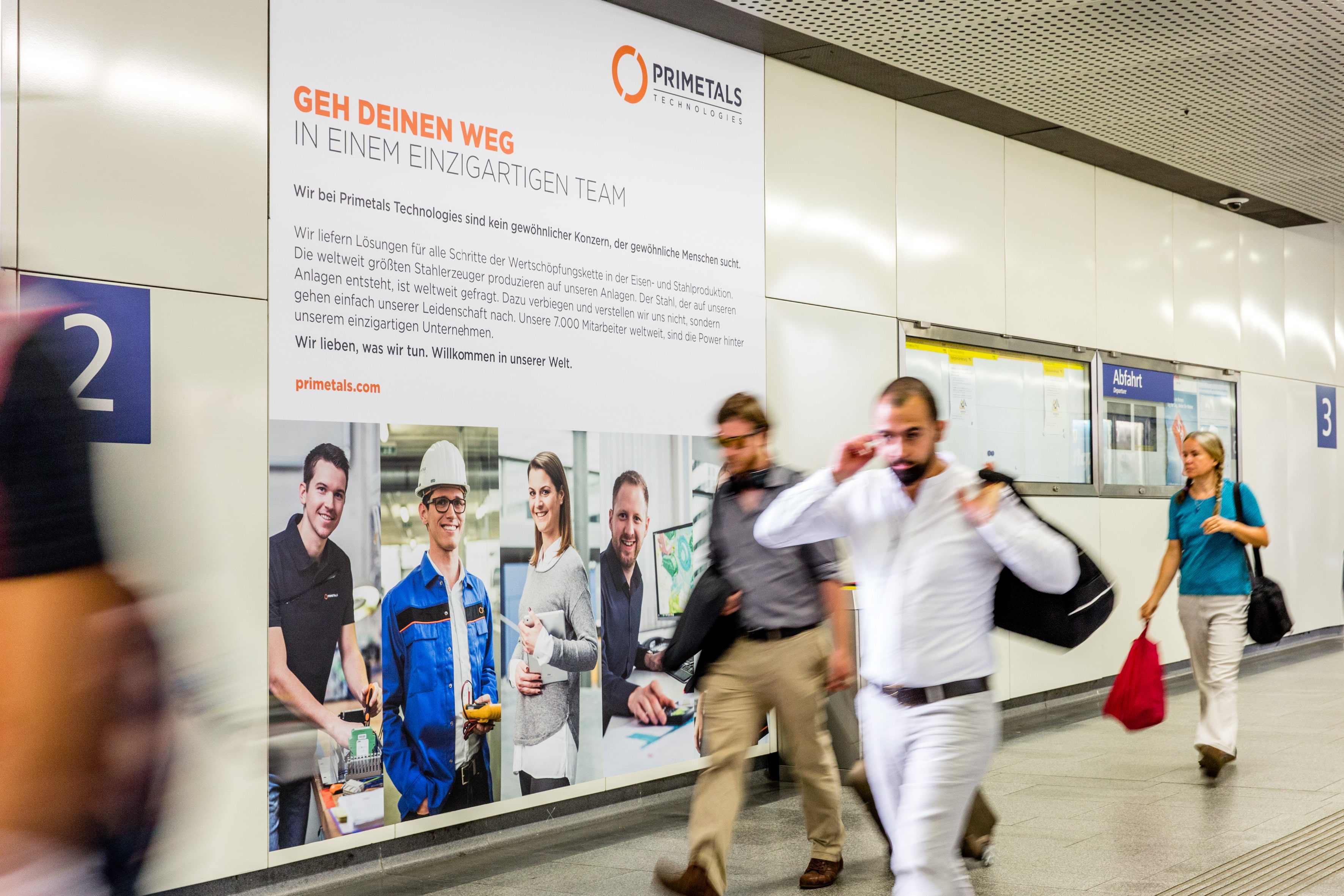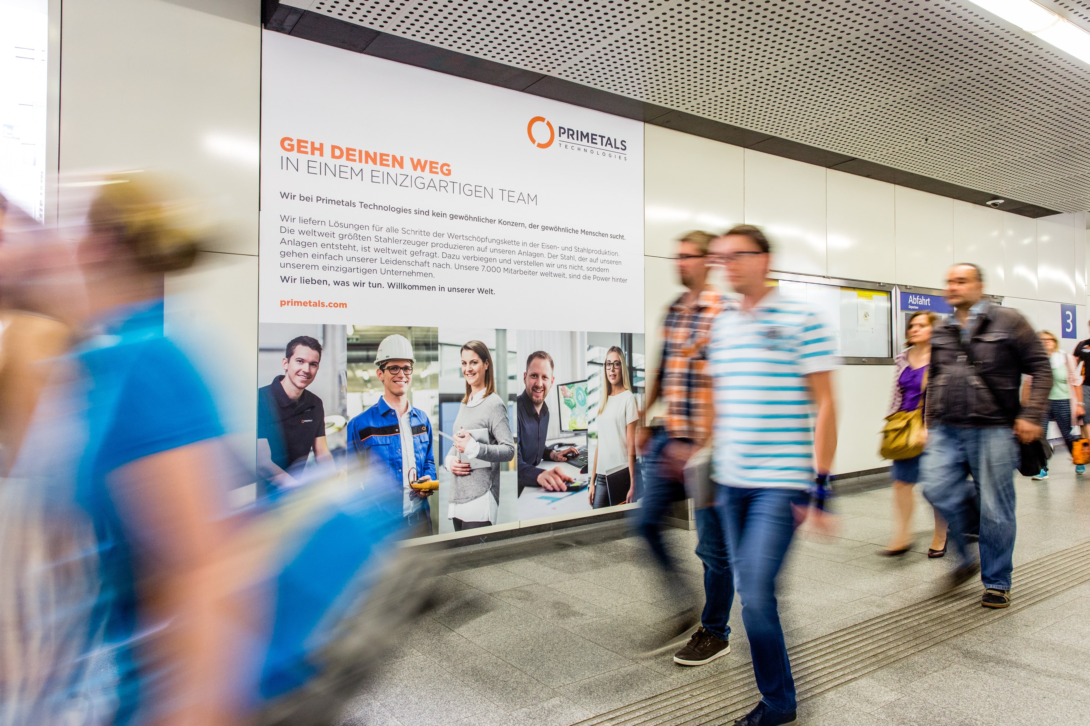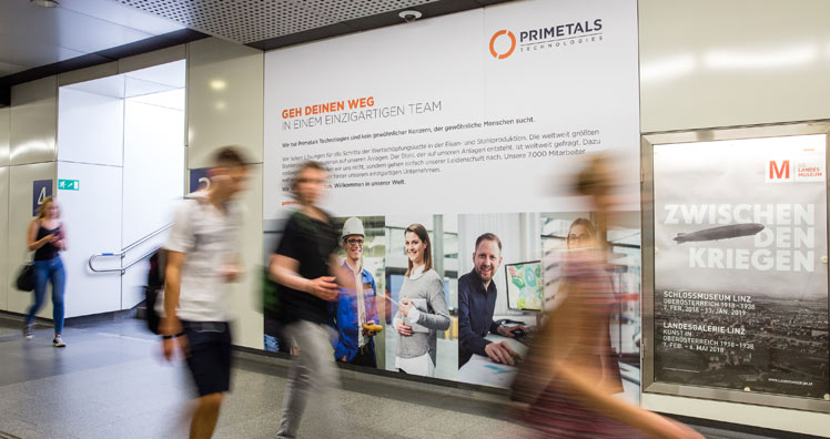 Primetals Technologies Austria GmbH will für seinen Standort in Linz in den kommenden drei Jahren bis zu 100 neue Fachkräfte einstellen. Gesucht werden die zukünftigen Mitarbeiter unter anderem auf dem Hauptbahnhof in Linz. Dabei greift das international tätige Technologieunternehmen auf die Werbeflächen und die Expertise der ÖBB Werbung – der Werbeunit der ÖBB – zurück. Für die großflächige Werbung an den Bahnhöfen Linz und Leoben wurden sogar neue Werbeflächen geschaffen, um Primetals langfristig beim Recruiting zu unterstützen.