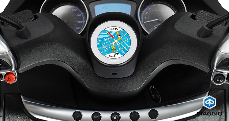 Die elegante Business-Variante für den Stadtverkehr zeichnet sich durch ihre edlen Details aus, wie ein neu designter Auspuff oder das mattgraue Finish der Felgen und des Mitteltunnels. Zur Standardausstattung gehört nun auch „Vio“, das erste für Motorräder entworfene, im Lenker integrierte TomTom-Navi. Das Navigationssystem kann über den USB-Anschluss im Handschuhfach aufgeladen und beim Parken einfach abgenommen werden.