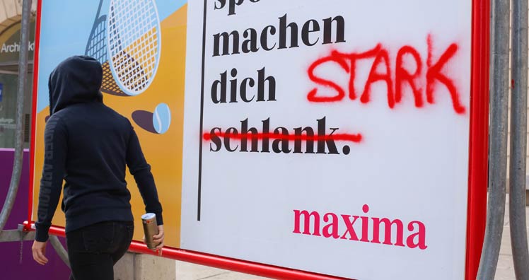 Das Frauenmagazin maxima hat mit Ski-Olympiasiegerin Anna Veith eine gemeinsame Aktion gestartet: Während eines Events der Vienna Fashion Week übersprühte der Skistar das neue Werbesujet des Magazins, um so ein Zeichen für Selbstbestimmtheit zu setzen. Die 29-jährige veränderte den ursprünglichen Slogan "Diese Trendsportarten machen Dich schlank" in ein selbstbewusstes "Diese Trendsportarten machen Dich stark".