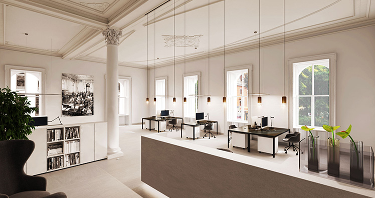 Die repräsentativen und hellen Gewerbeflächen im Hochparterre bieten einen einmaligen und ansprechenden Rahmen für Rechtsberater, Ärzte, Steuerberater, Architekten oder Gewerbetreibende aus dem Kunstsektor. Es sind jedoch nur mehr zwei Einheiten verfügbar. Die Fertigstellung ist Mitte 2019 geplant.
