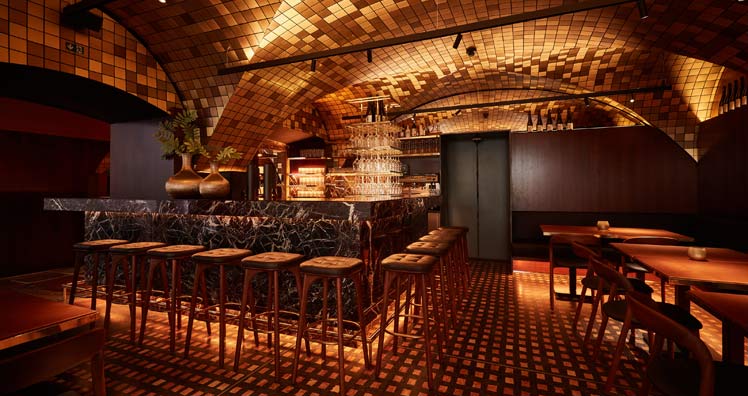 Gleich auf den ersten Blick besticht diese durch eine faszinierende Architektur und Bauweise. Die patinierten Messingmosaikplatten zieren die gesamte Gewölbedecke des Haupt- und Nebenraumes und sind der Eye-Catcher schlechthin. Das Unternehmenslogo des Hauses Koller + Koller etwa, welches eine tanzende Fee und einen Hahn zeigt und ein Design der in Barcelona lebenden Grafikkünstlerin Cristina Spano ist, wurde vereinzelt auf den Mosaikfliesen integriert und trägt zum einmaligen Charakter des Raumes bei.
