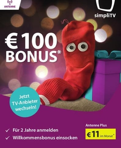 Alle Jahre wieder werden nach Weihnachten Geschenke umgetauscht, simpliTV beschenkt in einer neuen Aktion nun Neukunden, die schon vor Weihnachten ihren TV-Anbieter wechseln wollen. Kunden, die ihren bestehenden Anbieter gegen ein simpliTV Antenne Plus Paket tauschen, winkt ein 100 Euro Willkommensbonus. Bestandskunden, die derzeit die kostenlose HD-Registrierung von simpliTV nutzen, werden bei einem Umstieg auf Antenne Plus mit einem 100 Euro Treuebonus belohnt. Mehr als 40 Sender, die beliebtesten davon in HD, lassen sich mit diesem Paket empfangen. Zusätzlich steht kostenloses Streaming von acht Sendern zur Verfügung. Die Aktion ist bis 31. Dezember 2018 bei Neuanmeldung eines simpliTV-Pakets Antenne Plus mit zwei Jahren Mindestvertragsdauer auf Basis einer Jahresrechnung gültig.