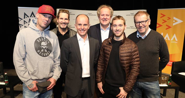 Die apokalyptischen Reiter Napster, YouTube, Spotify und Konsorten waren nicht nur Vorboten, sie haben tatsächlich das Musikbusiness völlig auf den Kopf gestellt und werfen ein Licht darauf, was anderen Branchen, allen voran der Kommunikationsindustrie, noch bevorsteht. "IAA on Stage" brachte gemeinsam mit dem Gastgeber Wiener Stadthalle, die beiden Musiker, Singer-Songwriter Nathan Trent und Rapper Jens Albert alias Der Wolf, Musikexperten und Produzenten Eberhard Forcher, Wiener Stadthalle-Chef Wolfgang Fischer und Produzent Ludwig Coss zur ersten IAA Business Communication Afterwork-Diskussionsrunde auf die Hauptbühne der Halle D der Wiener Stadthalle.
