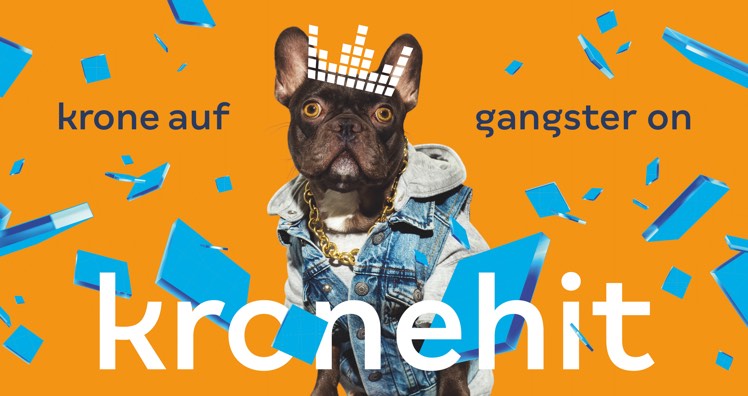 Auf Plakaten und in Spots wird er so unter anderem zu "Krone auf – Musik an" für die Party-Queen, "Krone auf – Augen zu" für ein küssendes männliches Liebespaar, "Krone auf – Party an" für den coolen Partytiger oder "Krone auf – Gangster on" für den stylishen Gangster-Rapper-Hund adaptiert. "Wer Kronehit aufdreht, dreht die Vielfalt des Lebens auf: gute Laune, gute Musik, gute Unterhaltung. In der Kampagne findet sich eine hedonistische und euphorische Lebenseinstellung wieder", kommentiert Kronehit-Geschäftsführer Ernst Swoboda.