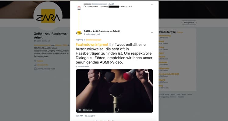 Die künstliche Intelligenz spürt negative Inhalte auf, unterzieht sie einer Sentiment-Analyse und kommentiert sie mit selbstproduzierten ASMR*-Videos unter dem Hashtag #calmdowninternet. Die KI wurde in kürzester Zeit mehr als fündig: seit Beginn der Kampagne wurden weit mehr als 1.000 Postings beantwortet. Dabei war die KI so aktiv, dass der offizielle Twitter-Account von ZARA aufgrund eines mittlerweile aufgeklärten Missverständnisses kurzzeitig von der Social Media-Plattform gesperrt worden war und erst seit Montag wieder online ist.