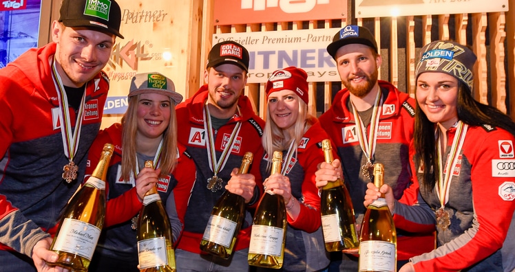 Dieser geschichtsträchtige Moment wurde, ebenso wie der gefeierte Athlet, standesgemäß mit prickelndem aus der Heimat bedacht. Die Sektkellerei Schlumberger, seit jeher Unterstützer und offizieller Partner des ÖSV, ließ es sich nicht nehmen unter den ersten Gratulanten mit prickelnder "Munition" für die obligate Sektdusche aufzuwarten und beschenkte die siegreichen Sportler um Marcel Hirscher mit personalisierten 1,5 Liter Magnumflaschen.