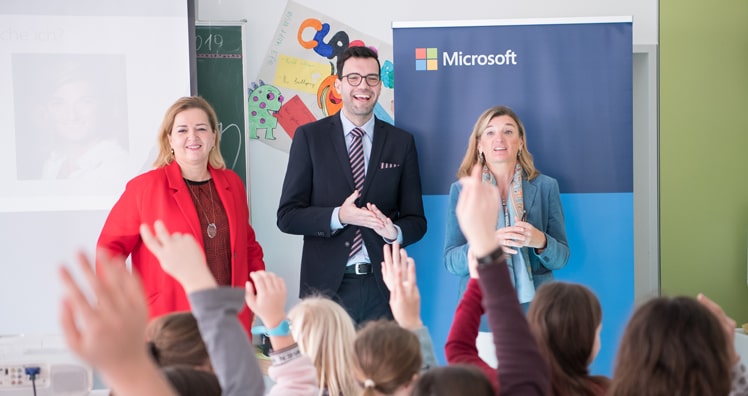 Rund 40 Microsoft und Grayling MitarbeiterInnen unterrichteten für einen Tag lang knapp 1.000 Wiener Schülerinnen und Schüler in digitaler Kompetenz. Den Anfang machten Bildungsdirektor Heinrich Himmer, Dorothee Ritz (General Managerin, Microsoft Österreich), Doris Kantauer (Education Lead, Microsoft Österreich) und Sigrid Krupica (CEO, Grayling Austria) in der Lerngemeinschaft 15 im 15. Bezirk und zeigten Möglichkeiten auf, wie Eltern und Erzieherinnen und Erzieher Jugendliche vor Betrügereien schützen können.