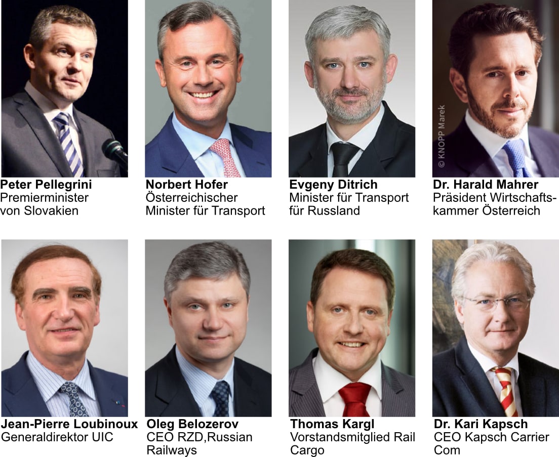 Dr. Li Yanni, Head of ICBC Austria Preparatory Team; Dieter Hengl, CEO Unicredit; NA Heeseung, President of the Korea Railroad Research Institute (KRRI); Michele Molinari, CEO Molinari Rail Group; Thomas Limberger, CEO European lnfrastructure Management; Vadim Mikhailov, First Deputy CEO, Russian Railways; Andreas Reichhardt, State Secretary Austrian Ministry of Transport; Oleg Toni, deputy CEO, Russian Railways; Dr. JANG Hwanbin, Korea Railroad Research Institute (KRRI); Simon Fletcher, Coordinator Europe UIC; Francis Bedel, Chief Digital Officer UIC; Jan Harder, CEO Moinari Rail Systems; Heinz Gschnitzer, Chief Coordinator Project Wide Gauge ÖBB Infrastruktur AG; Alexander Schierhuber, CEO Breitspurplanungsgesellschaft; Alexey Shilo, Deputy CEO of JSC "Russian Railways"; Alberto Grisone, Development Director of Russia, Hupac lntermodal CA; Dr. Barbara Kolm, CEO AEC, Vice President OeNB, Supervisory Board ÖBB; Rolf Jansson, President and CEO, VR Group; Andrew Meaney, Partner, OXERA Consulting LLP; Dr. Stefan Buske, Rechtsanwalt Deutschland; Attorney Germany; Maria Leenen, CEO, SCI Verkehr Gmbh; Harald Jony, CEO Wiencont; Markus Fröhlich, Managing Director, APEX Rail GmbH; Sergey Sharapov, Deputy General Director of IEDT; Vladimir Salamatov, CEO, International Trade and Integration Research Center (ITI); Alexander Misharin, First Deputy General Director, JSC Russian Railways; Alexey Shilo, CEO of the Centre for Commercial Transport Services, JSC Russian Railways; Dr. Paul Achleitner, Chairman Deutsche Bank; Christian Forster, Managing Director Apex Rail; Karl Blaim,CFO Siemens Mobility GmbH; Alexey Grom, President, Chairman, United Transport and Logistics Company- Eurasian Railway; David John, CTO TMH International AG; Helmut Schreiner, CTO Zillertaler Verkehrsbetriebe AG