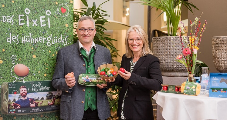 Wie Martina Hörmer, die Geschäftsführerin der Eigenmarken der Rewe International AG und Franz Pazek, Obmann des Vereins zur Förderung der Freilandhaltung und Sprecher der Bauern hinter Tonis Freilandeier am Mittwoch im Rahmen eines Pressefrühstücks verkümdetem, startet die Eier-Marke unter dem Rewe-Dach zum Frühlingsbeginn in einem frischen Packungsdesign und mit einer eigenen Oster-Edition neu durch.