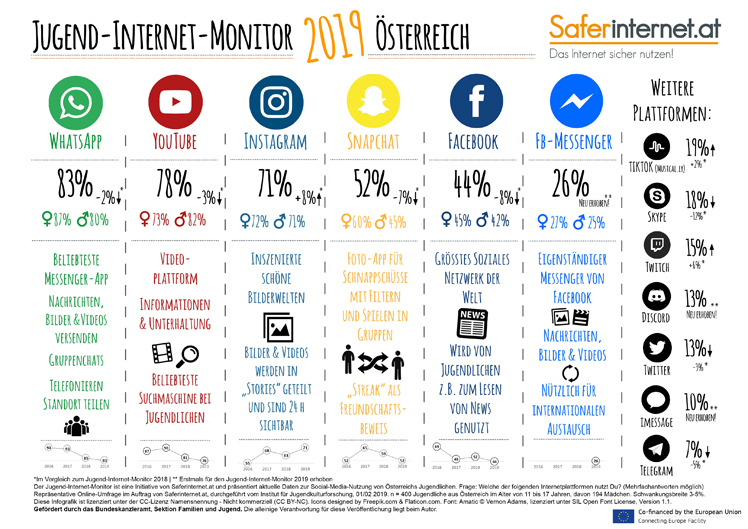Skype, 2018 im Ranking noch direkt hinter Facebook auf Platz sechs, ist auf Platz acht zurückgefallen. Die Nutzungszahlen sanken um zwölf Prozentpunkte auf 18 Prozent. Erstmals erhoben wurde heuer der Facebook-Messenger, den 26 Prozent der Jugendlichen nutzen. Damit liegt er auf Platz sechs. TikTok (früher Musical.ly) bleibt stabil auf Platz sieben mit einem Zuwachs von knapp zwei Prozentpunkten (19 Prozent).