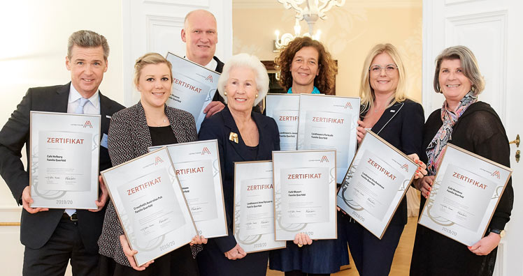 Seit kurzem zählt die Familie Querfeld mit ihren Lokalen zu den zertifizierten österreichischen Leitbetrieben. Berndt Querfeld nahm gemeinsam mit seiner Mutter Anita Querfeld, Gattin Irmgard Querfeld sowie Andrea und Karoline Winkler die Auszeichnung im Rahmen einer feierlichen Zeremonie in der Bel-Etage des Café Landtmann von Leitbetriebe Austria-Geschäftsführerin Monica Rintersbacher entgegen.