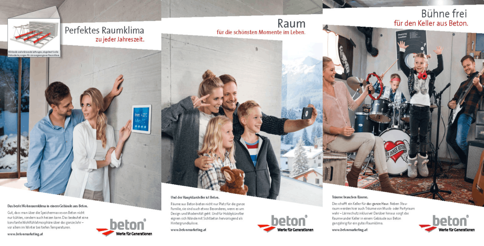 Erstmalig wurde in den Jahren 2013 und 2014 Bewegtbild-Werbung mit Spots für das lineare TV produziert. Nach zwei Kampagnen mit "Mundl"-Ikone Karl Merkatz als bodenständigem Testimonial laufen aktuell Kampagnen-Spots mit einer vierköpfigen Familie im Fernsehen. Der ehemals als "Baustoff des 20. Jahrhunderts" bezeichnete Beton komme im 21. Jahrhundert als "Hightech-Baustoff" daher, für die zeitgemäße Bewerbung wird nun in einem zweistufigen Auswahlverfahren das perfekte Werber-Match gesucht.