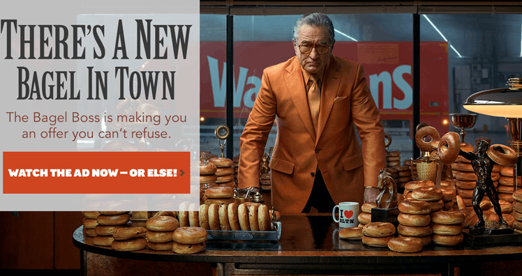 Der zweiminütige, cineastisch aufbereitete Spot namens "GoodBagels" stammt aus der Kreativschmiede der Agentur Engine and Freuds und bewirbt Warburtons neue Bagel-Linie. Im Clip sieht man den A-List Schauspieler aus Filmen wie "Der Pate", "Good Fellas" und "Taxi Driver" wie er in Warburton's Büroräumlichkeiten im britischen Bolton vorstellig wird um seine Vision vorzustellen: in diesem Szenario folgt man De Niro und seinen mafiösen Handlangern dabei, wie sie Warburtons Bagel Business übernehmen und seine Produkte einem Rebranding unterziehen, das von diesem Moment an unter dem Namen "GoodBagels" firmieren soll.