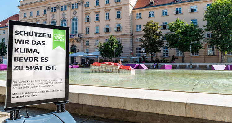 Ein Schreckensszenario mit starker Botschaft und angesichts des Klimawandels, mit dem auch Hochwasser einhergeht, nicht ganz realitätsfern. Die Installation zur "Sunken Cities"-Aktion wird für rund eine Woche zu sehen sein – ein Besuch lohnt sich und lädt Schaulustige zum Selfies machen ein. Unter dem Hashtag #oebbklimaschutz sind Fotos der Aktion in den diversen Social Media Kanälen zu finden.