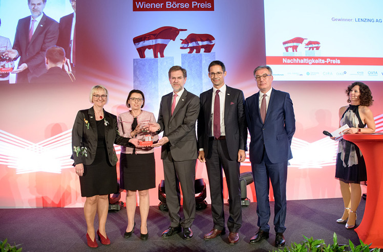 Stephanie Kniep (Head of Investor Relations Lenzing AG), Waltraud Kaserer (Vice President Corporate Communications Lenzing AG), Andreas Zakostelsky (Vorsitzender VÖNIX-Beirat / Vorstandsvorsitzender VBV –Vorsorgekasse AG), Stefan Doboczky (Vorstandsvorsitzender Lenzing AG), Fritz Mostböck (Präsident ÖVFA Österreichische Vereinigung für Finanzanalyse / Head of Group Research Erste Group Bank AG), Sandra König (Moderatorin / ORF-Ö3) © Wiener Börse/APA-Fotoservice/Hörmandinger
