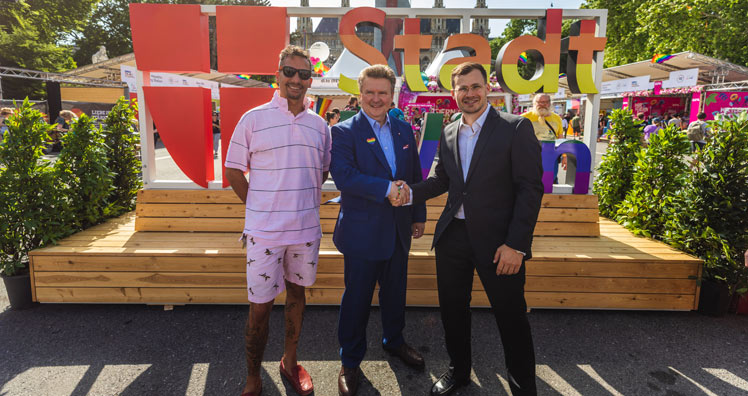 Zusammen mit der Werbeagentur Warda Network feierte die Stadt am Mittwochnachmittag die Einweihung der neuen Sitzinsel am Rathausplatz. Nicht nur die Sitzinsel selbst wurde gefeiert – auch die Eröffnung der PrideVillage. Von Mittwoch bis Samstag kann jeder Teil des farbenfrohen Spektakels sein.