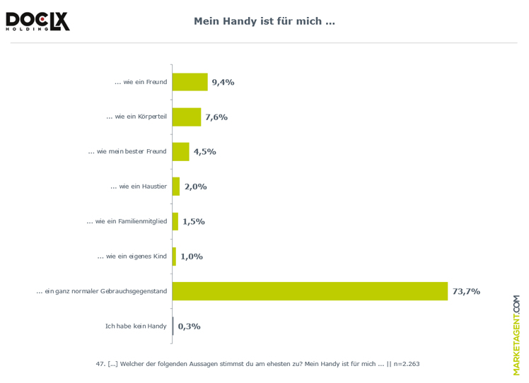 73,7 Prozent der 14- bis 29-jährigen sehen ihr Smartphone als normalen Gebrauchsgegenstand. Bedenklich ist, dass ein Zehntel (9,4 Prozent) es als "Freund" bezeichnet und 7,6 Prozent es schon als eigenen Körperteil betrachten. Durchwegs kritisch ist die Einstellung zur Nutzung des digitalen Dauerbegleiters: 78,4 Prozent sagen, dass ihre Freunde zu viel Zeit mit dem mobilen Device verbringen und 72,2 Prozent sind sich bewusst, dass sie selbst zu viel Zeit in gebückter Haltung über dem Smartphone investieren. Nur 24,2 Prozent kritisieren dies an ihren Eltern.