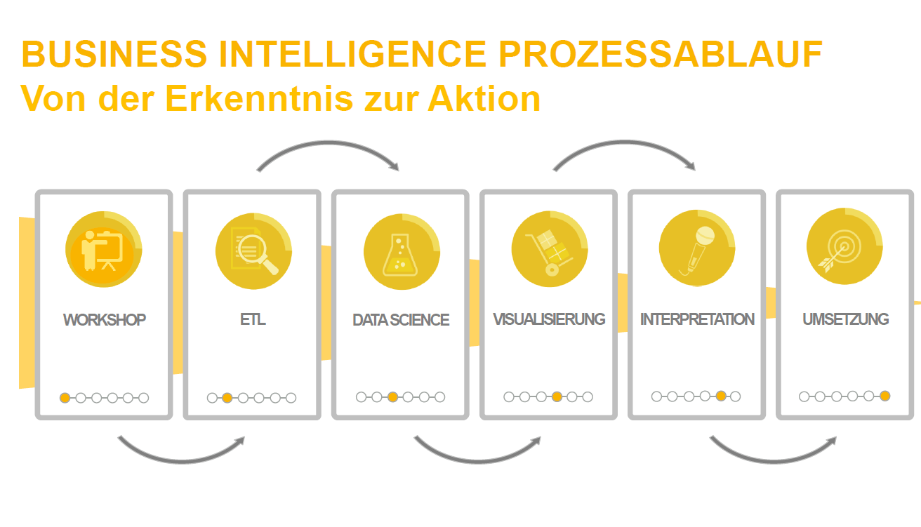 Wir haben für die Umsetzung der BI Projekte einen Prozess entwickelt, der sich in sechs unterschiedliche Phasen einteilen lässt: Kick-Off Workshop, ETL, Data Science, Visualisierung, Interpretation und betriebliche Umsetzung. Die folgende Grafik veranschaulicht diesen Prozess: