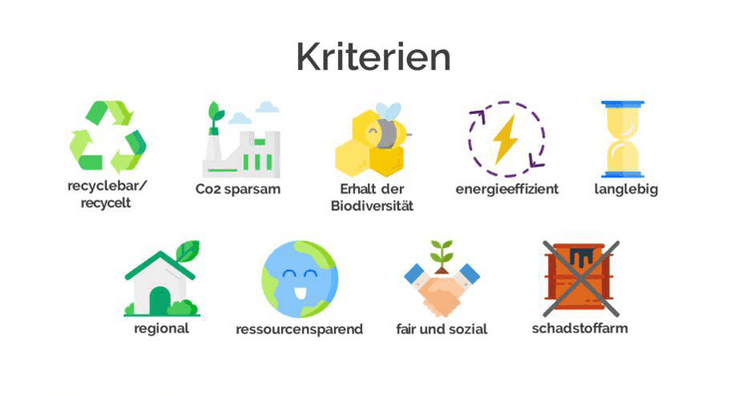 Die Produktpalette reicht von Haushaltsgeräten, Bekleidung, Sportprodukten und Hygieneartikeln bis hin zu Dienstleistungen wie Stromanbieter, Reparaturservice und Kapitalanlagen. Alle Produkte, die auf beeanco angeboten werden, müssen mindestens zwei von insgesamt neun Nachhaltigkeitskriterien (siehe Grafik unten) erfüllen.