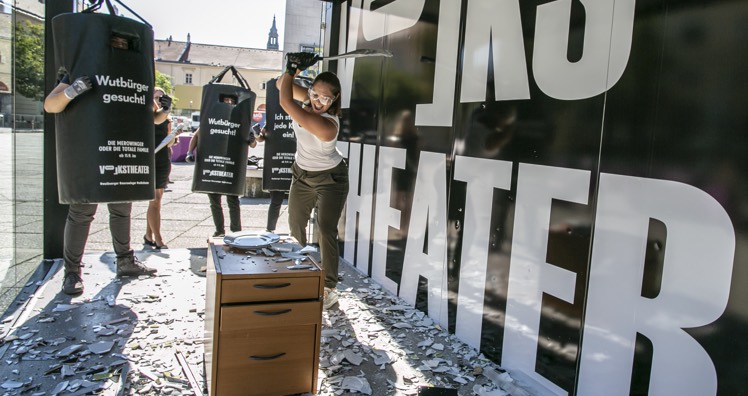 Die Teilnehmer können es so der zu explosiven Wutausbrüchen neigenden Hauptfigur Freiherr Childerich III. von Bartenbruch gleichtun und sich dann tiefenentspannt dem Theatergenuss im Volkstheater widmen. Der Wutraum ist vom 4. bis 11. September täglich außer montags von 16 bis 20 Uhr geöffnet. Nach der Anmeldung vor Ort erhalten die Teilnehmer eine kurze Einweisung sowie Schutzkleidung und können ihrer Wut für fünf Minuten freien Lauf lassen.