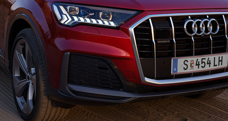 Der Audi Q7 zeigt die SUV-typischen Elemente der aktuellen Designsprache. Neben dem großen Singleframe in Oktagon-Form, der ihn noch kraftvoller wirken lässt, sind auch die zweiteiligen seitlichen Lufteinlässe und der Schwellerbereich deutlich expressiver gezeichnet.