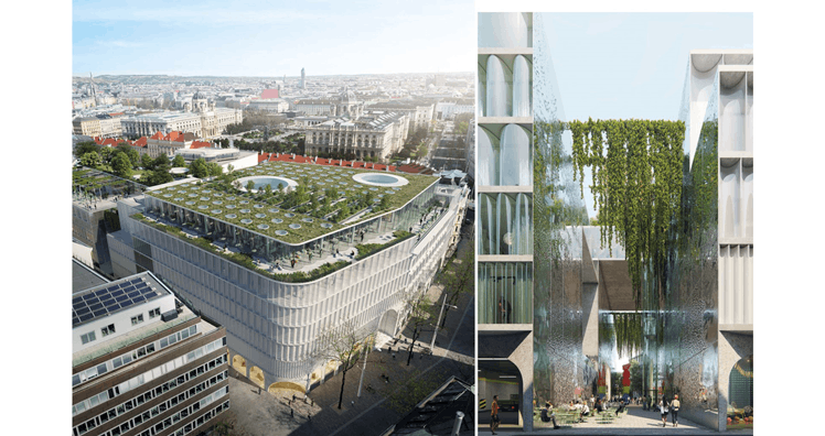 Vor allem die Dachlandschaft des Wiener Neo-"KadeWe" soll sich beeindruckend entwickeln. OMA hat diesen nämlich als öffentlich zugänglichen Dachgarten konzipiert, erläuterte Ellen van Loon. Der Park werde sich über eine Fläche von 1.000 Quadratmetern erstrecken. Im Erdgeschoß wiederum werden die Schaufenster in Form von Bögen ausgearbeitet. Die Fassade selbst besteht aus zylindrischen Glasmodulen. Im obersten Stockwerk wird es ein umfangreiches Gastro-Angebot geben.