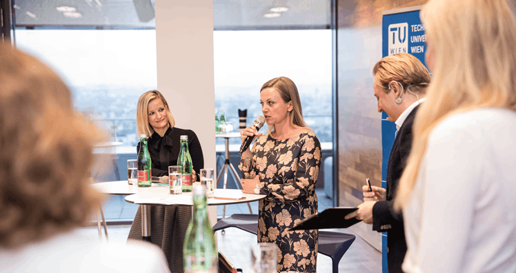 Rund 100 Besucherinnen und Besucher diskutierten in der Skylounge der TU Wien "TUtheSky" gemeinsam mit hochrangigen weiblichen Führungskräften über die aktuelle Situation von Frauen in Führungspositionen in Österreich.