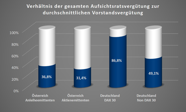 Aus dem Corporate Governance Monitor 2019 geht hervor, dass in Österreich die durchschnittliche Vergütung für eine Person im Aufsichtsrat zwischen 14.000 und 23.000 Euro im Jahr beträgt – im Vergleich dazu liegt der Wert in Deutschland um ein Vielfaches höher: zwischen 68.000 und 171.000 Euro. Erhebliche Unterschiede bestehen auch in der Vergütung des Aufsichtsrats im Verhältnis zu jener des Vorstands: Ein Vorstand verdient in Österreich im Durchschnitt das 24- bis 26-fache im Vergleich zur durchschnittlichen Aufsichtsratsvergütung, in Deutschland liegt dieser Wert beim 18-Fachen.