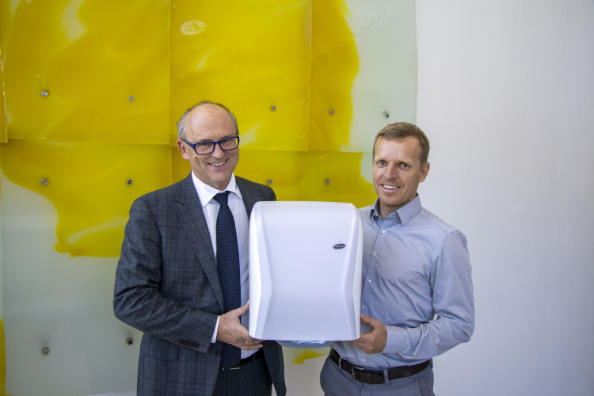Christoph Lind leitet bei Hagleitner die Entwicklungsabteilung: "Information ist der Schlüssel, dank ihr lassen sich öffentliche Bereiche effizient und nachhaltig verwalten. Wo droht das Papier auszugehen? Ein Smartphone hat heute praktisch jeder Mensch dabei – wer immer im Service beschäftigt ist. Das heißt, die Daten aktualisieren sich automatisch im Hintergrund – beim Vorüberspazieren." Hierzu Firmeninhaber und Geschäftsführer Hans Georg Hagleitner: "Lange Zeit ist nichts ohne komplizierte Netzwerk-Technologie gegangen – erschwinglich für wenige. Mit dieser Innovation aber braucht es nur noch ein Smartphone, das besitzen Sie und ich: Ihr Spender ist im Nu als digitales Abbild bei der Hand – und gleich anschließend in der Online-Cloud. So wird Hagleitner den Waschraum weiter aufwerten – überall auf dem Globus. Denn das Internet of Toilet steht jetzt einer breiten Basis offen, Hagleitner hat es für viele Unternehmen greif- und leistbar gemacht." Tor ins Digital-WC ist eine App.