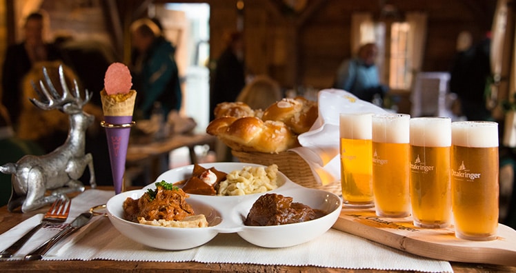 Stimmiges Rot-weiss-rotes Kulinarikkonzept: vom Wildgulasch und Coney bis zur Feuerzangenbowle