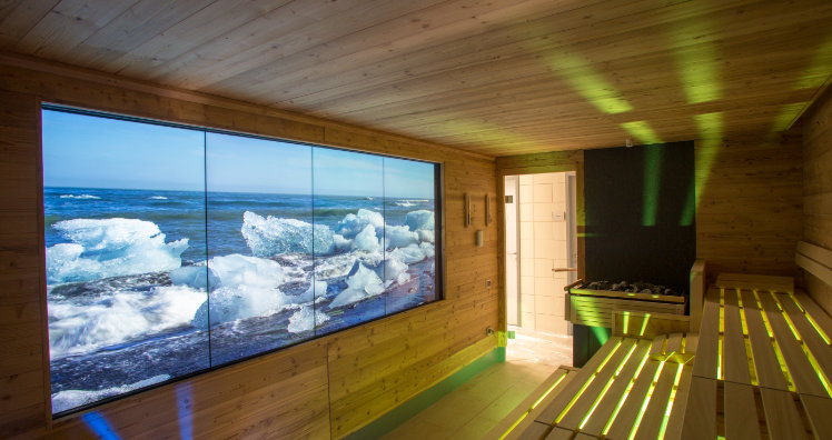 Wüstenimpressionen bei 90 Grad, Alpengipfel in der Biosauna oder treibende Eisschollen: Atmosphere by KLAFS holt die Natur in die Sauna und bietet den Gästen ein spannendes und beeindruckendes Erlebnis für alle Sinne. Bis zu vier Bildschirme sind es, die – bei sehr filigraner Rahmenkonstruktion - modular in der Sauna angebracht werden und in höchster Auflösung ein durchgängiges Bild erzeugen. Bespielt werden die – selbstverständlich für den dauerhaften Betrieb unter Saunabedingungen konstruierten - Screens mit faszinierenden Naturfilmen, die eigens für diesen Zweck in einer Auflösung von 8K produziert werden – und zwar von professionellen Kamerateams, die vom Polarkreis über die Bergwelt bis in die Tropen atemberaubende Aufnahmen einfangen.