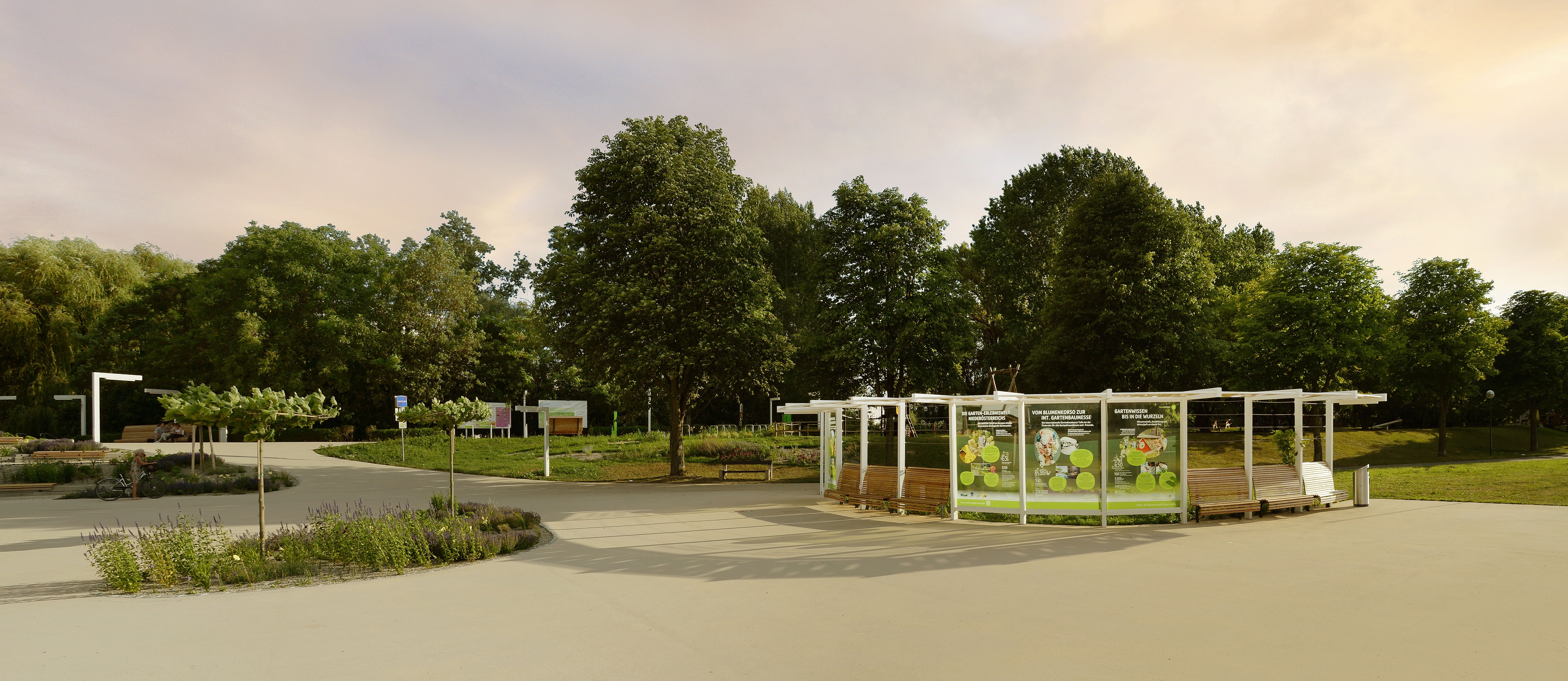 Sellinger: Entstanden sind farbenfrohe, mäandrierende Stauden- und Gräserbeete, die sich an die Geländemodellierung anpassen und spannungsreiche Räume bilden. Inmitten dieser ansprechenden naturnahen Gestaltung mit schattenspendenden Schirmplatanen bieten Freiflächen viel Platz zum Picknicken, Spielen und Verweilen für alle Nutzergruppen. Verschiedene Sitzgelegenheiten aus Holz laden zur Entspannung aber auch zum Ausblick in die Landschaft ein. Gleichzeitig macht die Wassertreppe - eine Sitz- und Liegedeck-Konstruktion - mit einem direkten Zugang zur Donau das Erlebnis am Wasser möglich. Beim Gästehafen wurde eine multifunktionale Veranstaltungsfläche geschaffen. Eine begrünte Pergola bietet den Schiffstouristen zudem eine beschattete Wartemöglichkeit. Eine Blumentreppe mit Sitz- und Liegegelegenheiten überbrückt gestalterisch den Höhenunterschied zwischen dem Gästehafen und dem internationalen Donauradweg. Von hier aus werden die Gäste Tullns – insbesondere Radtouristen – mit innovativen Gestaltungselementen über den Klosterweg weiter ins Stadtzentrum eingeladen. Als gestalterisches Highlight gelten die von grünplan designten, multifunktionalen "Frames", weiße Metallkonstruktionen die sowohl als Beleuchtung, Landschaftsinstallation, Infotafel und Pergola dienen.