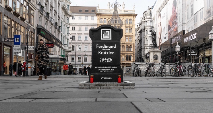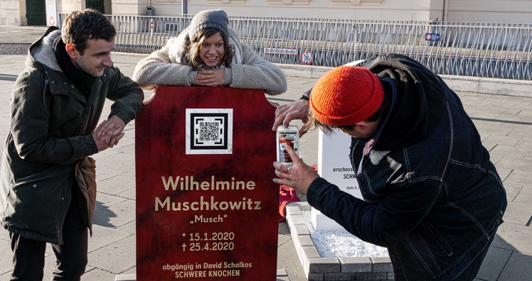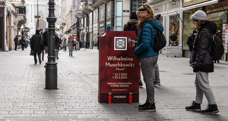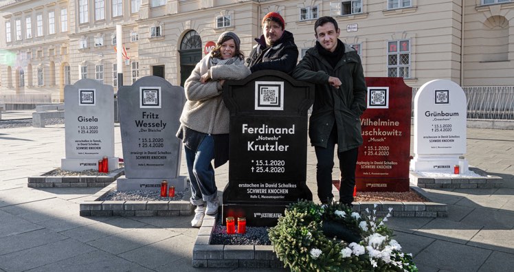 "Mit Theatermagie sterben auf der Bühne regelmäßig Schauspieler, die sich anschließend quicklebendig vor dem Publikum verbeugen. Diesen Gedanken auch ins Digitale zu ziehen macht mir große Freude", so Volkstheater-Intendantin Anna Badora zum Hintergrund der Aktion. Flankiert werden die Grabsteine durch in ganz Wien sichtbare Plakate mit Todesanzeigen der Schwere-Knochen-Protagonisten, auf denen ebenfalls die QR-Codes mit Link zum Video abgebildet sind. (as)
