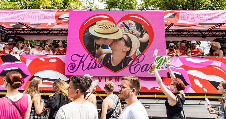 Nach den statischen Säulen möchten wir zeigen, dass LED-Wände auch mobil eingesetzt werden können. Ein besonders aufsehenerregendes Beispiel war die KISS-Cam, die Habegger Austria bei der Regenbogen-Parade im Einsatz hatte. Dort war die große LED-Wand auf einen Laster montiert und bewegte sich so durch die Menschen-Mengen. Daneben lief ein Kamerateam, das immer wieder küssende Pärchen filmte und auf die LED-Wand am Lastwagen übertrug. Das Beispiel zeigt, dass LED-Wände auch robust genug sind, um mobil transportiert zu werden und Hitze oder Regen zu trotzen.