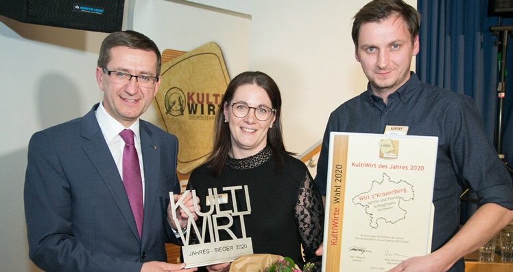 Das Siegespodest wurde heuer besonders perfekt erklommen: der Wirt "Z'Kraxenberg" aus Kirchheim im Innviertel ist mit einer unübertrefflichen Spitzenbewertung von 1,00 in der Genuss-Spechte-Wertung unbestritten würdiger Träger des diesjährigen KultiWirte-Landestitels. Die Inhaber des familiengeführtenTraditionswirtshauses, Florian und Sybille Schlöglmann, freuten sich über diese weitere Ehrung ihrer Gaststätte, denn 2017 wurde das "Z'Kraxenberg" vom Gault Millau mit einer Haube ausgezeichnet. Die Trophäe zum "KultiWirt" nahmen die Wirtsleute beim KultiWirte-Fest in Kirchberg-Thening aus den Händen von Wirtschafts- und Tourismus-Landesrat Markus Achleitner, WKOÖ-Vizepräsidentin Margit Angerlehner und KultiWirte-Obmann Karl Wögerer in Empfang.