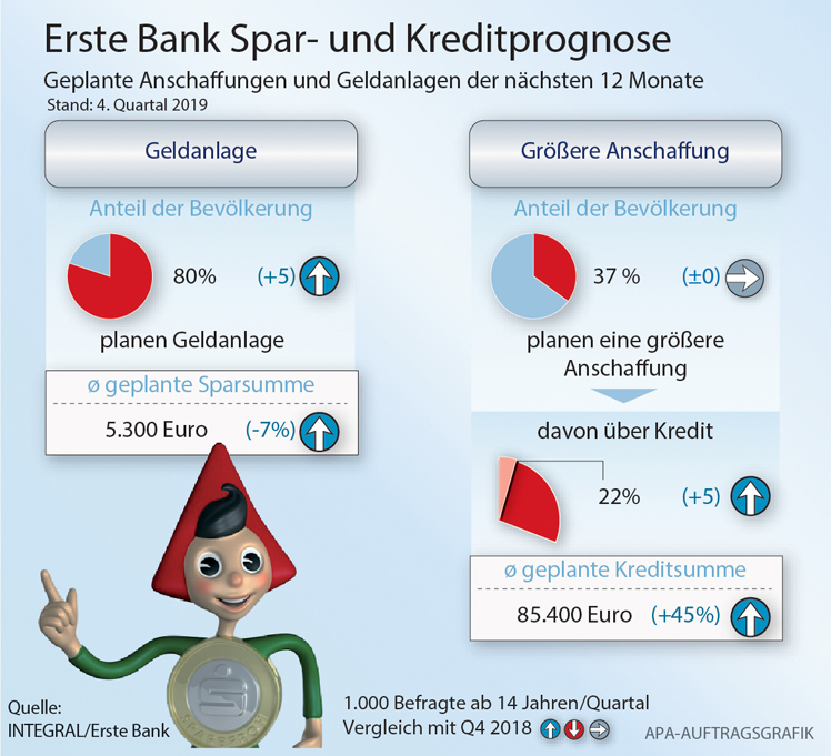 Laut einer Integral-Studie im Auftrag der Erste Bank planen 37 Prozent der Österreicher 2020 eine größere Anschaffung zu tätigen. 22 Prozent wollen dieses Vorhaben mit einem Kredit oder einem Bauspardarlehen finanzieren. Eigene Ersparnisse wollen 79 Prozent dafür heranziehen – im Jahr 2018 waren es noch 89 Prozent.