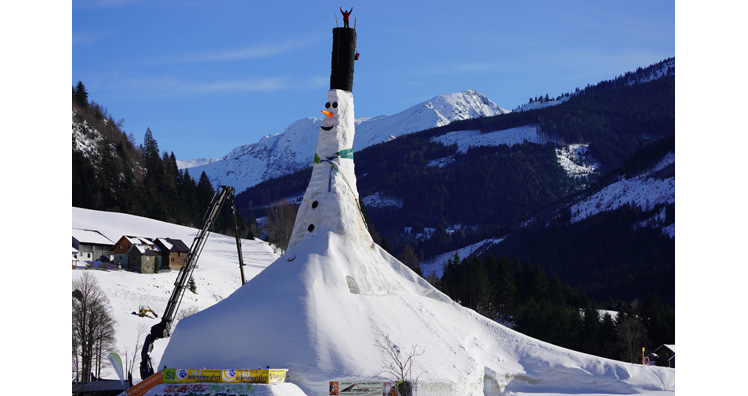 Der größte Schneemann der Welt steht seit dem Wochenende in der österreichischen Urlaubsregion Schladming-Dachstein. An der Talstation des Skigebiets Riesneralm in Grimming-Donnersbachtal haben fleißige Helfer in den letzten Wochen rund 800 Tonnen Schnee aufgetürmt. Mit dem fast 40 Meter hohen weißen Riesen hat sich das fünfköpfige Team um Projektleiter Gerhard Peer den Eintrag ins Guinness Buch der Rekorde gesichert.