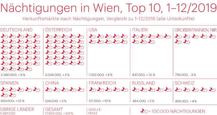 Innerhalb der zehn nächtigungsstärksten Herkunftsmärkte entwickelten sich 2019 Italien, Spanien und Frankreich mit zweistelligen Wachstumsraten, Deutschland, Österreich, die USA, China, Russland und die Schweiz mit einstelligen. Großbritannien blieb unter seinem Vorjahreswert. Wiens aufkommensstärkste Fernmärkte USA (2019 gab es erstmals über 1 Million US-Nächtigungen), China und Japan tragen überproportional zum Erfolg der oberen Kategorien, insbesondere der 5-Sterne-Häuser, bei: 27 Prozent der US-Nächtigungen, 14 Prozent jener aus China sowie 18 Prozent jener aus Japan fanden 2019 in der 5-Sterne-Kategorie statt.