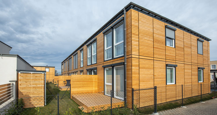 Schlüsselfertig übergeben, sind sie emissionsarm, CO2 bindend und die Baukomponenten von der Materialökologie schadstofffrei verarbeitet, feuchtigkeitsausgleichend und wärmedämmend. Sämtliche Bauteile können wiederverwertet werden. Die kleineste Einheit umfasst 55 Quadratmeter, die größte 93 Quadratmeter.