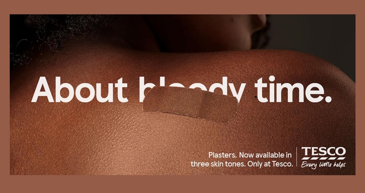 Mit der Bewerbung der neuen Pflaster hat Tesco die Agentur Bartle Boogle Hegarty (BBH London) betraut, die Plakate mit einer klaren Aussage entworfen hat: "About bloody time", zu Deutsch "War verdammt nochmal Zeit", so die klare Aussage der Werbesujets, die sich im Englischen ein schönes Wortspiel zunutze machen. Das Wort "bloody" bedeutet wortwörtlich übersetzt "blutig" und wird gerade im englischen Sprachgebrauch oft als Fluchwort bemüht. (Beispiel "If it hadn't been for that bloody traffic jam, I would have been punctual for the meeting with Mr.X" – übersetzt: Wenn mir dieser verdammte Stau nicht einen Strich durch die Rechnung gemacht hätte, wäre ich pünktlich zum Meeting mit Herrn X erschienen"., Anm.d.Red.) "About bloody time" bekommt im Zusammenhang mit der beworbenen Thematik – am Plakat wird das Wort "bloody" durch das dunkle Pflaster halb überklebt – also eine doppelte Bedeutung.